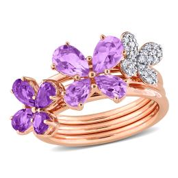Julianna B Rose Plated Sterling Silver Amethyst & Diamond Floral Ring Set