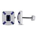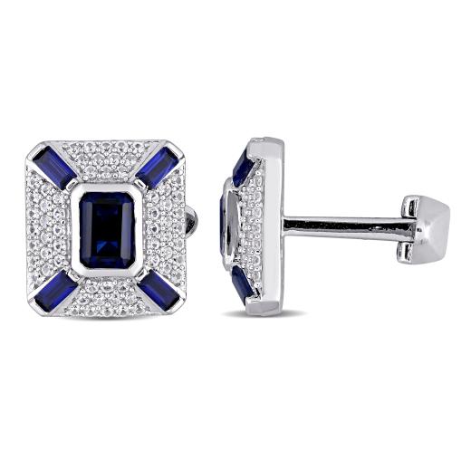 These sparkling created blue sapphire and created white sapphire cufflinks are a stunning way to enhance a suit. Crafted in lustrous sterling silver, they feature two emerald-cut, bezel-set created blue sapphire gemstones and eight baguette-cut, channel-set created blue sapphire gemstones along with 120 round-cut, pave-set shimmering created white sapphire gemstones. These men's gemstone cufflinks secure using whale back closures. Polished to brilliance, these marvelous men's cufflinks will have you feeling your best all day long.