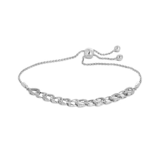 Freshen up your look with this stylish bolo style bracelet. Crafted in sterling silver, the open link design is bedazzled in 0.10ctw of near colourless diamonds. The toggle wheat chain is adjustable to fit most wrists.