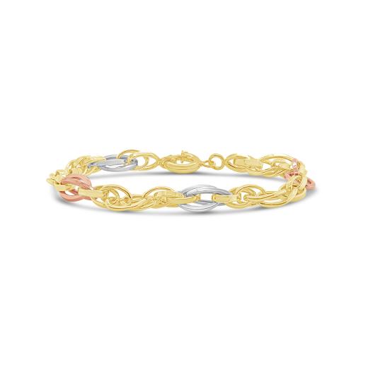 This 10k tri colour gold knotted link bracelet shines with 10k white, yellow and rose gold links for a look that is versatile and sleek with a touch of sparkle from its high polish. A timeless and classic piece to add to your jewellery collection.