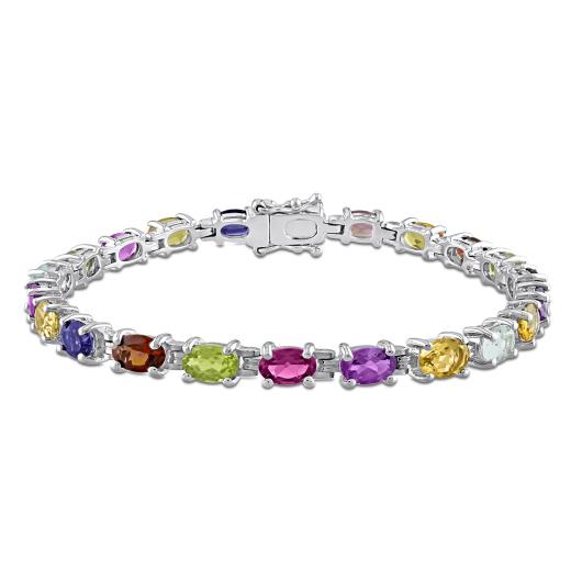Adorn your wrist with this fabulous Multi-colour Gemstones Oval Link Bracelet to stand out. Crafted in glowing sterling silver, it features 22 oval-cut, prong-set multi-color gemstones (6 x 4mm) forming an oval pattern and decorating the band for a classy look. Enhanced with a high polish finish, this glittering 7-inch long bracelet secures with a pressure tongue clasp. This exquisite gemstone oval link bracelet is sure to make a standout addition to any jewelry collection. This dazzling link bracelet is sure to add a burst of color and class to any occasion.