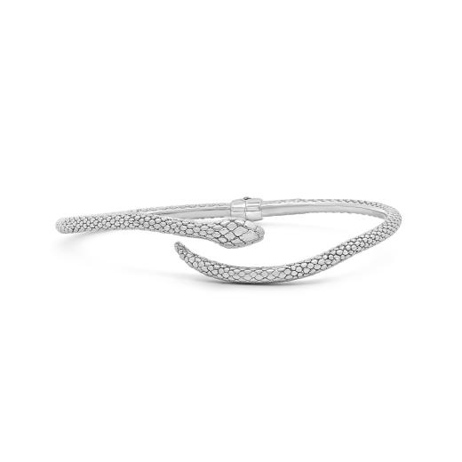 Mysterious and sleek, this sterling silver snake bracelet wraps gracefully around the wrist with a sinuous silhouette and polished finish. Its fluid form channels ancient symbolism with a contemporary twist, exuding both power and allure.