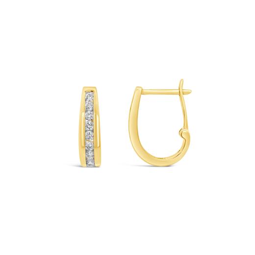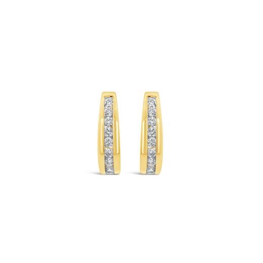 Beautifully matched round diamonds are elegantly channel set in hoops of 10k yellow gold. These .75ctw earrings are secured by hinged backings