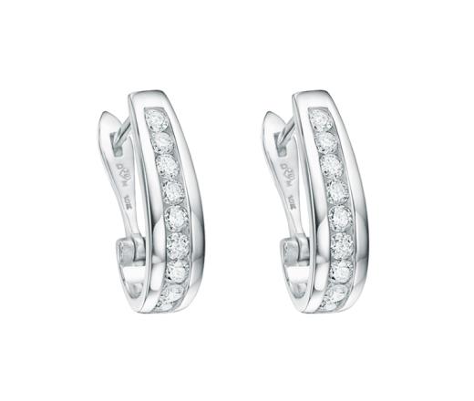Round diamonds are channel set in beautiful hoops of 10k white gold. The earrings have a total diamond weight of 1.00 carats with secure hinged backings