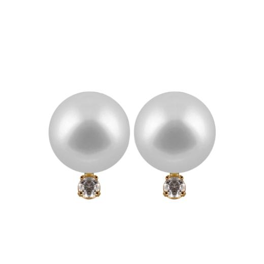 White cultured salt water 5-5.5mm pearls are set in 14k yellow gold are simply elegant in these earrings for her. Single round diamonds provide the finishing touch to each earring