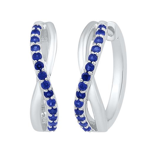 These dazzling hoop earrings feature round-cut created blue sapphire stones. This wondrous pair is set in sterling silver and are secured with clip-in backs.