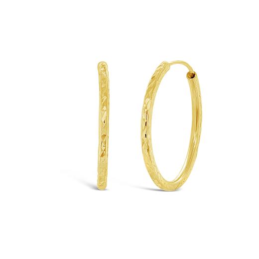 These classic endless hoop earrings are crafted in sleek 10k yellow gold and feature a sparkling diamond cut pattern. These earrings are a lovely choice to suit all occasions and are great for travelling.
