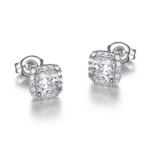 These earrings feature a striking square halo design, with a central stone surrounded by a ring of smaller stones that enhance its brilliance. The geometric shape adds a modern twist to the classic halo style, making these earrings a bold and elegant choice.