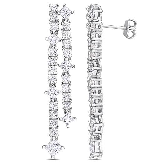 Elevate your elegance with these Women's 5 3/4 CT TGW Created White Sapphire Fashion Post Earrings in Silver. Meticulously designed, these double linear drop earrings embody a perfect blend of delicate charm and sparkling allure. The created white sapphire gemstones, totaling 5 3/4 carats in weight, exude a captivating brilliance that adds a touch of glamour to any ensemble. The combination of square-cut and round-cut gems creates a dynamic and shimmering effect. Set in lustrous silver, these earrings are a testament to fine craftsmanship, making them a thoughtful gift for her or a cherished addition to your jewelry collection. Their delicate and elegant design adds a touch of understated beauty to your look, embracing the spirit of timeless elegance and fashionable grace. Celebrate the allure of created white sapphire with these exquisite post earrings that capture the essence of enduring style and the captivating beauty of gemstones.