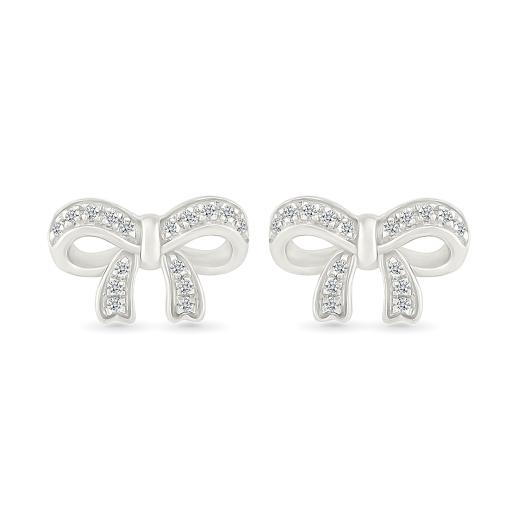 These diamond bow stud earrings in gleaming sterling silver bring a sweet and sophisticated touch to any style. Featuring a delicate bow design accented with shimmering diamonds, they offer just the right amount of sparkle. A timeless and charming accessory, perfect for everyday elegance or a heartfelt gift.
