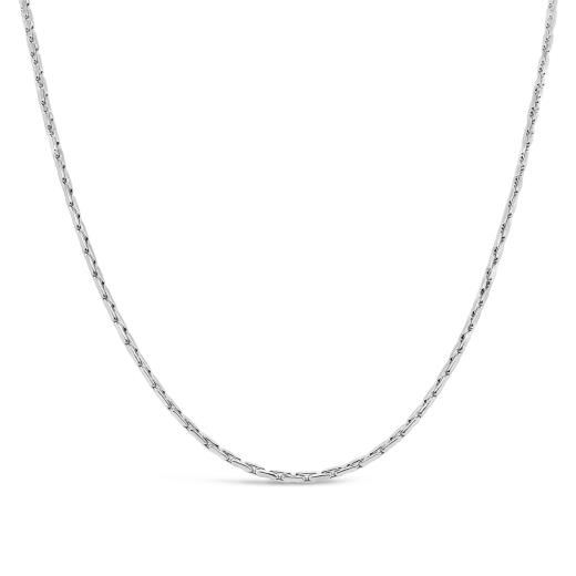 An 18-inch 10K White Gold Corena Chain, delicately slender at 0.90mm, offers a refined simplicity. Its understated elegance makes it a versatile piece, perfect for highlighting pendants or standing alone with subtle sophistication.