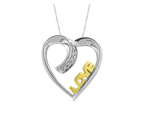 Give her your heart with this stunning sterling silver and 10k yellow gold pendant. Simply created with a beautifully shaped open-heart design and sparkling diamond accent. This lovely piece is one she will cherish.