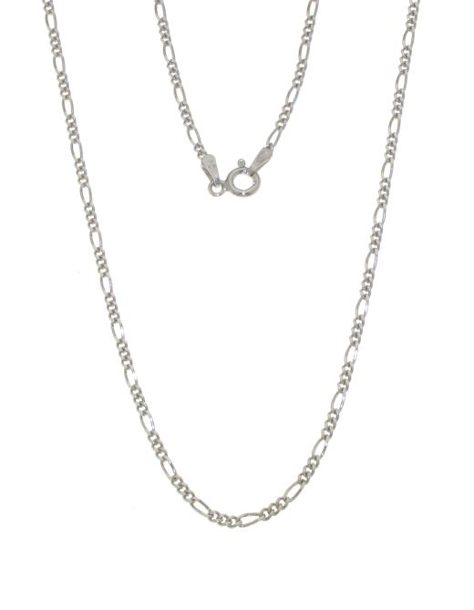 The Figaro chain is characterized by its pattern of three small circular links followed by one elongated oval link, creating a distinctive and visually appealing design. The 1.7mm width of the chain strikes a balance between subtlety and presence, making it suitable for both casual and formal wear.