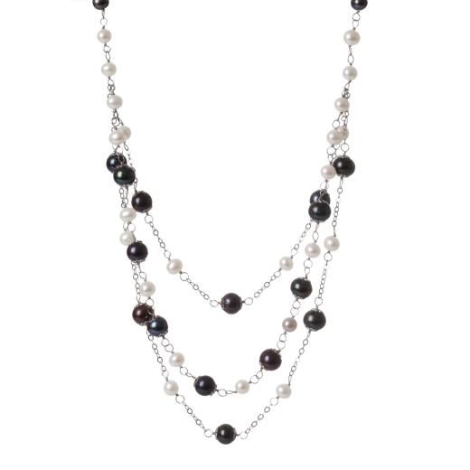 Sterling silver fancy 3 rows necklace with white and black freshwater pearls.