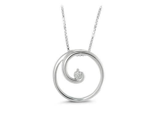 A single scintillating diamond is the focal point of this delightful pendant. This pendant sways from an 18" sterling silver box link chain and has a total diamond weight of .05 carat.