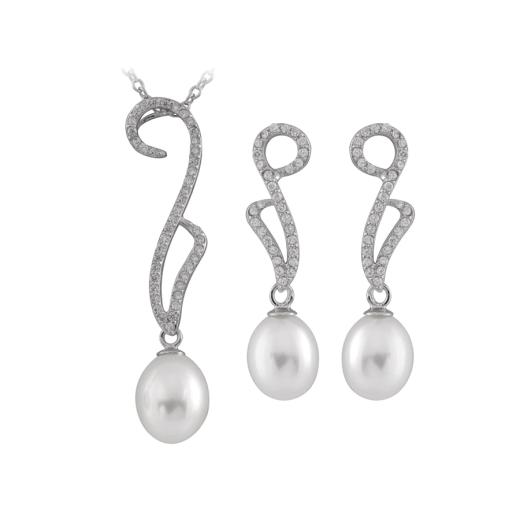 Sterling Silver pendant/17"chain with 7-8mm rice shape pearls and cubic zirconia with matching earrings.