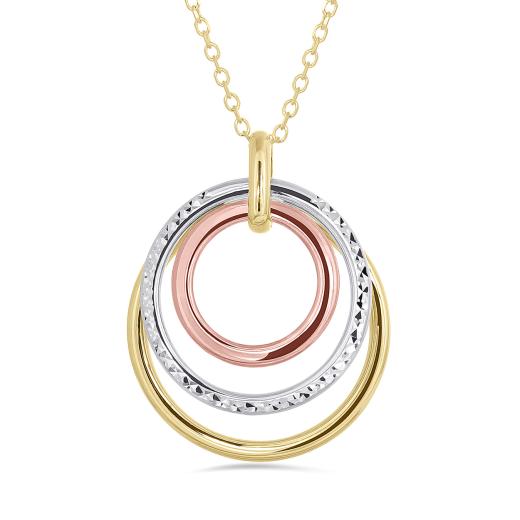 The pendant features a mesmerizing tri-colour design, combining the warm glow of 10K yellow gold with the timeless beauty of white and rose gold. This harmonious blend of colours creates a striking and distinctive piece that adds depth and character to your ensemble.