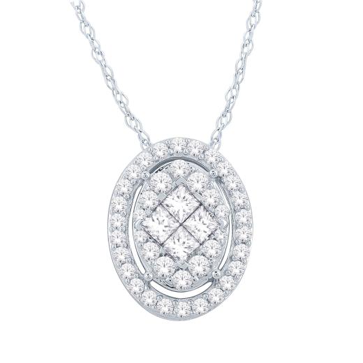 This piece features a stunning oval-shaped design set in 10K white gold, with diamonds totaling 0.50 carats. This elegant pendant offers a refined and timeless look, perfect for adding a touch of sparkle to any occasion.