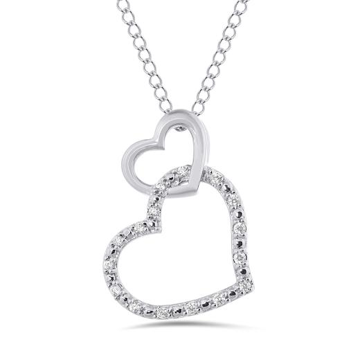 Let this sweet pendant be a charming metaphor of your love and support. Crafted in shimmering sterling silver, the two heart diamond design are linked in an enduring embrace. Showcasing 0.05ctw of sparkling diamonds, this pendant dangles from an 18" cable link chain.