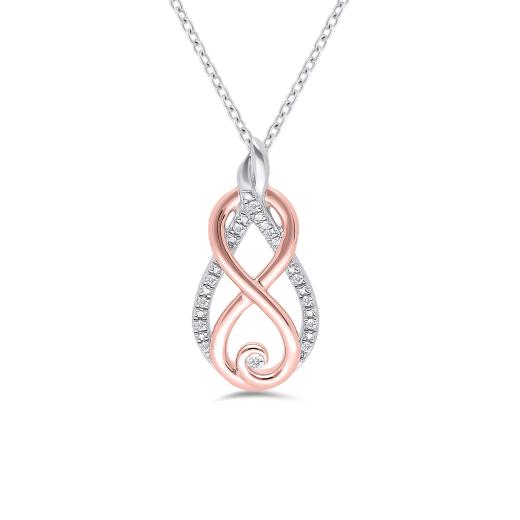 Wrap her in your love with this infinity pendant from the Infinite Love Collection. Created in sterling silver and rose gold plating, a ribbon of 0.04ctw of diamonds is adorned with an infinity symbol. It is dangling from an 18" chain and secured with a spring ring clasp.