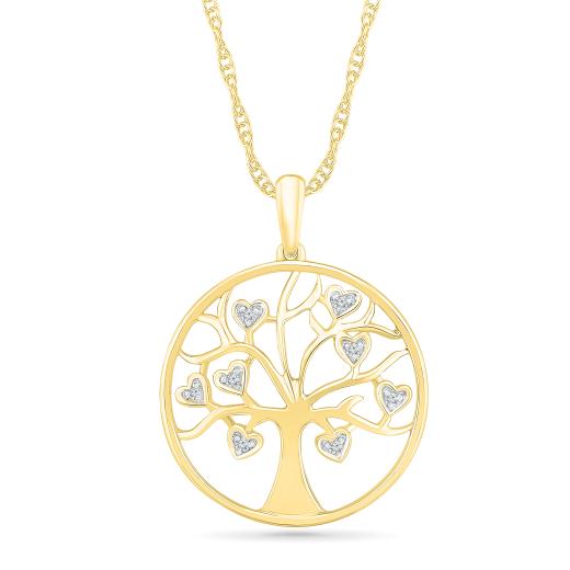 Crafted in glowing 10-karat yellow gold and adorned with 0.05 carats of diamonds, this pendant showcases a delicate tree motif. The design symbolizes growth, nature's enduring beauty, and the interconnectedness of life. With its timeless yellow gold and just the right amount of sparkle, it's the perfect adornment for those who appreciate both style and meaningful symbolism.