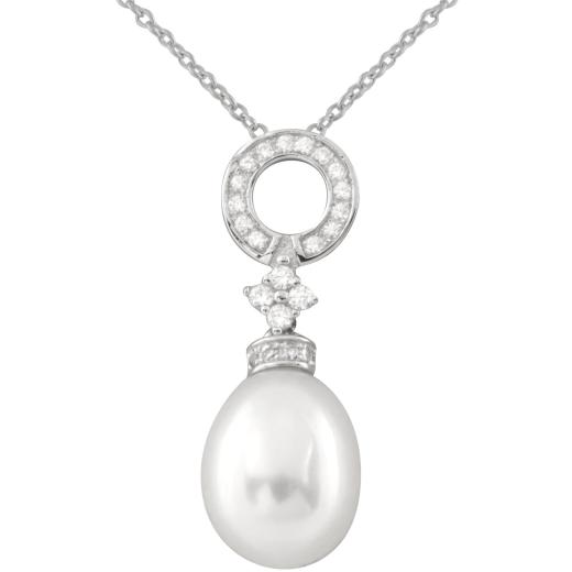A 9-10mm white freshwater pearl pendant with cubic zirconia accents in sterling silver rhodium plated