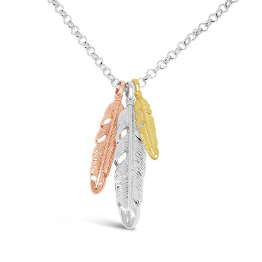 Feathers symbolize trust, honour, strength, wisdom, power, and freedom. This stunning pendant is crafted in sterling silver with accents of yellow and rose plating. Hung on a 24 inch chain, this piece is sure to become a favourite in your jewellery collection.