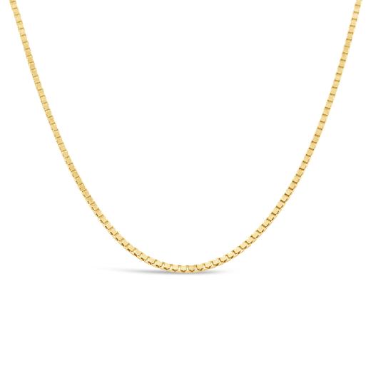 The box-style links create a smooth, structured design that catches and reflects light beautifully with every movement. The warm yellow gold adds a timeless touch of luxury, making this chain perfect for both everyday wear and special occasions. Its versatile design allows it to be worn alone for a refined statement or paired with a pendant for added flair.