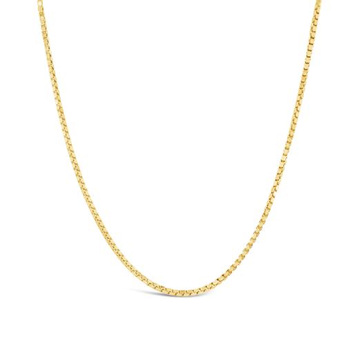 This delicate 0.9mm box chain in 10K yellow gold offers a sleek and refined look, perfect for everyday wear or as a subtle complement to a pendant. The interlocking box links create a smooth, uniform shine that adds a touch of elegance to any neckline, making it a versatile and timeless addition to your jewellery collection.