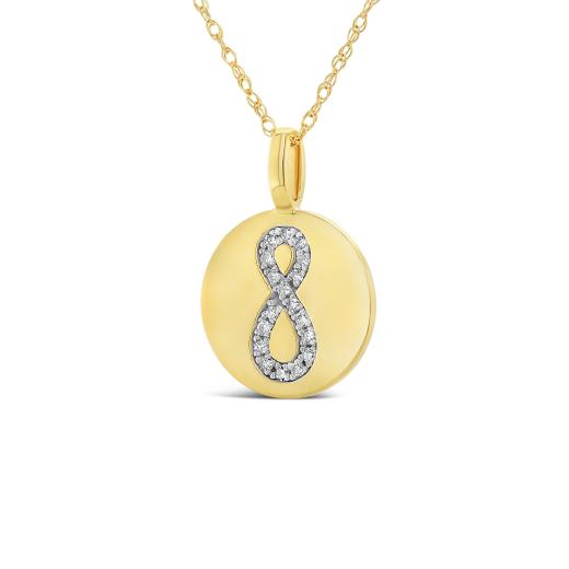 This pendant is a radiant expression of eternal connection, featuring a disc adorned with the timeless symbol of infinity crafted in lustrous yellow gold. The addition of diamonds adds a touch of brilliance, creating a piece that symbolizes enduring love and infinite elegance.