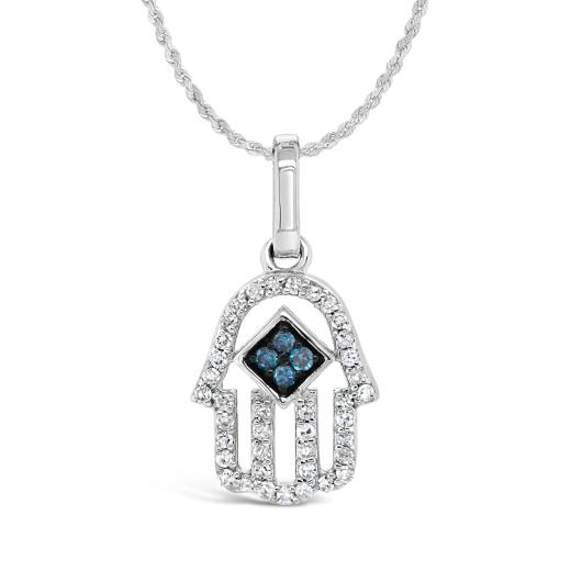 Embrace the symbolic beauty of the Sterling Silver 0.10CTW White & Blue Diamond Hamsa Pendant and let its spiritual significance and dazzling diamonds enhance your style with grace and positivity. This pendant is not only a fashion statement but also a meaningful expression of faith and protection, designed to uplift and inspire.