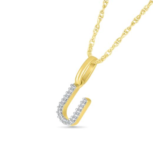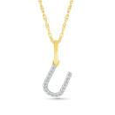 This pendant showcases the letter "U" in 10K yellow gold, beautifully adorned with diamonds for an elegant and timeless look. The gold's warmth paired with the diamonds' sparkle creates a sophisticated design, ideal for adding a personal touch to your jewellery collection or gifting someone special.