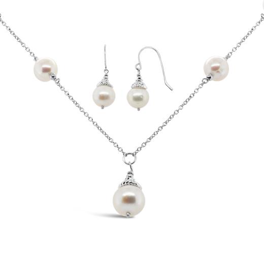 The set features lustrous freshwater pearls, each carefully selected for its smooth, radiant sheen. The necklace is designed to sit gracefully on the neck, with pearls strung together to create a sophisticated, timeless look. Paired with matching pearl stud earrings, this set adds a refined touch of luxury to any occasion.