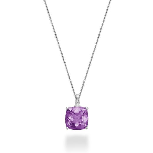 Simple and timeless, this gorgeous pendant is crafted in 10-karat white gold and features a cushion-cut amethyst accented by a round-cut diamond. A classic look, this stunning piece is a perfect choice for today's contemporary and sophisticated person.