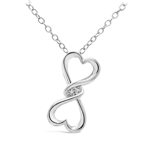 This pendant features a charming design crafted in sterling silver, with two hearts delicately intertwined and adorned with a sparkling diamond accent.