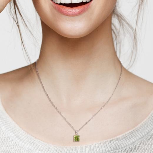Keep up with the trend with this stylish Peridot Solitaire Pendant with Chain. Crafted in luminous sterling silver, this glamorous pendant features a princess-cut, 4 prong-set peridot gemstone (6x6mm) in a classic basket setting. Polished to a brilliant shine, this enchanting pendant is suspended on an 18-inch round cable chain secured with a spring ring clasp. An accessory that will make you the talk of the town.