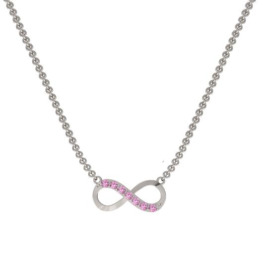 This elegant necklace features a radiant created pink sapphire, set in a delicate sterling silver infinity design. The soft pink hue of the sapphire symbolizes love and beauty, while the infinity shape represents eternal bonds and endless possibilities. The polished sterling silver setting enhances the stone's brilliance, creating a piece that exudes both sophistication and meaning. Perfect for adding a subtle pop of colour to any outfit, this necklace is a timeless addition to any jewellery collection.