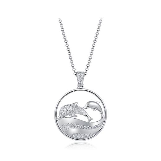 This sterling silver pendant features a charming dolphin design with waves, adorned with sparkling cubic zirconia for a touch of brilliance. Hanging from a 19-inch chain, it beautifully combines the grace of the dolphin with the movement of the ocean, making it a perfect accessory for ocean lovers or a unique, elegant addition to any outfit.