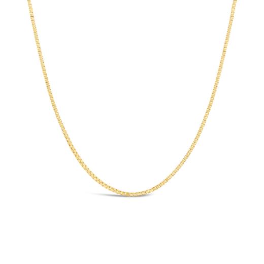 This 14K yellow gold box chain, measuring 0.8mm in width and 18 inches in length, offers a sleek and sophisticated design. Its perfectly interlocking links create a smooth, durable chain that adds a subtle yet elegant touch to any pendant or stands beautifully on its own.