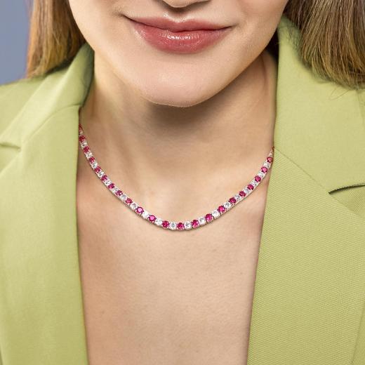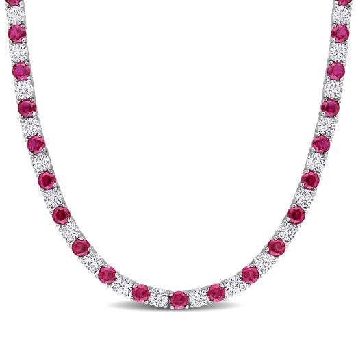 Pamper yourself with this attractive Tennis Necklace. Mounted in glistening sterling silver, this dainty necklace features 52 round-cut created ruby gemstones (4x4mm) and 51 round-cut created white sapphire gemstones (4x4mm) placed alternatively on the strand. This 17-inch necklace is secured with tongue and groove clasp. Polished to brilliance, this classy necklace will add sparkle to your favorite outfit.
