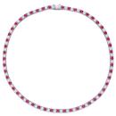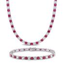 An ideal gift for a woman who loves stones, this Created Alternating White Sapphire and Ruby Tennis Bracelet and Necklace Set is indeed a striking piece. Crafted in lustrous sterling silver, this dual-colour 17-inches long stunning necklace showcases 51 round-cut, white created sapphire (4x4mm) and 52 round created ruby (4x4mm) gemstones. The matching classy, 7.25" long bracelet features 21 round-cut white created sapphire gemstones (4x4mm) and 21 created round-cut ruby gemstones. Finished with a brilliant shine, the necklace, and the bracelet set are secured with a tongue and groove clasp. Coordinate with a beautiful red cocktail dress for a flattering look.