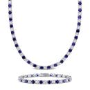 An ideal gift for a woman who loves to get on her glam, this Created Alternating White and Blue Sapphire Tennis Bracelet and Necklace Set is indeed a stunning piece. Crafted in lustrous sterling silver, this dual-colour 17-inches long stylish necklace showcases 51 round white created sapphire (4x4mm) and 52 round created blue sapphire (4x4mm) gemstones. The matching classy, 7.25" long bracelet features 42 round white and blue created sapphire (4x4mm) gemstones set in an alternating fashion. Finished with a brilliant shine, the necklace, and the bracelet set are secured with a tongue and groove clasp. Coordinate with a beautiful blue cocktail dress for a flattering look.