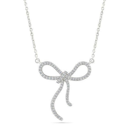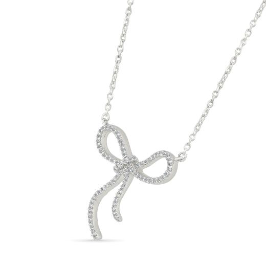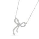 This diamond bow necklace set in shining 10K white gold features a beautifully tied knot bow design. Adorned with shimmering diamonds, this necklace adds a touch of elegance and movement, making it a perfect blend of grace and sophistication. Ideal for any occasion, it brings a refined, whimsical charm to your collection.