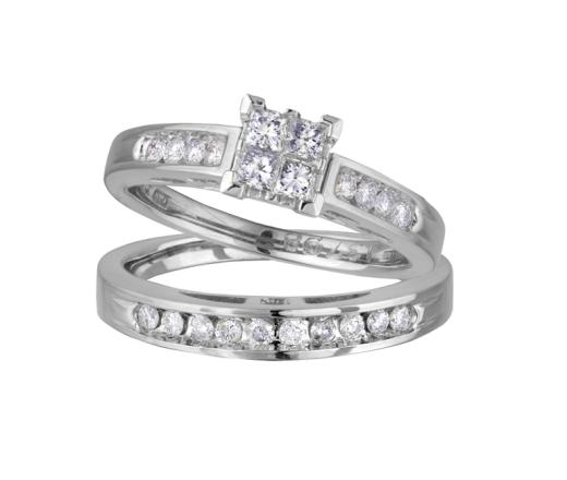 A quartet of sparkling princess cut diamonds is showcased in this breathtaking diamond princess engagement ring. Brilliant round diamonds are channel set along the side of the gleaming 14k white gold band. The matching wedding band features additional bright round channel set diamonds for added brilliance. This princess diamond bridal set has a total diamond weight of .50 carats.