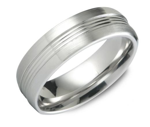 A 7mm white cobalt band with three central line details cut into the face. Look extraordinary in this modern yet classic ring.