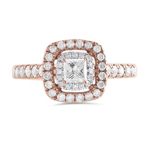 Enchant her with this stunning .81ctw bridal ring in 14k rose gold featuring a double halo and a princess cut centre stone, adorned with diamonds along the band.