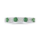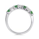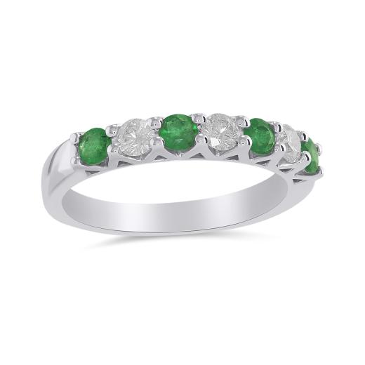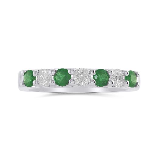 This charming ring features four round cut emeralds and three brilliant cut diamonds. This magnificent anniversary band is crafted in glittering 14k white gold and is sure to add a touch of elegance to your collection.