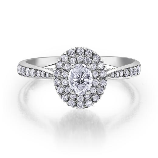 Celebrate your love with a true Canadian Treasure. Featuring a breathtaking .30ct oval Glacier Fire Canadian diamond, hugged by dazzling double halo for a bold diamond look and endless sparkle. A tapered channel set diamond band completes this romantic bridal look.