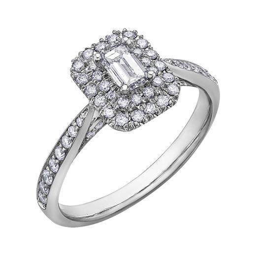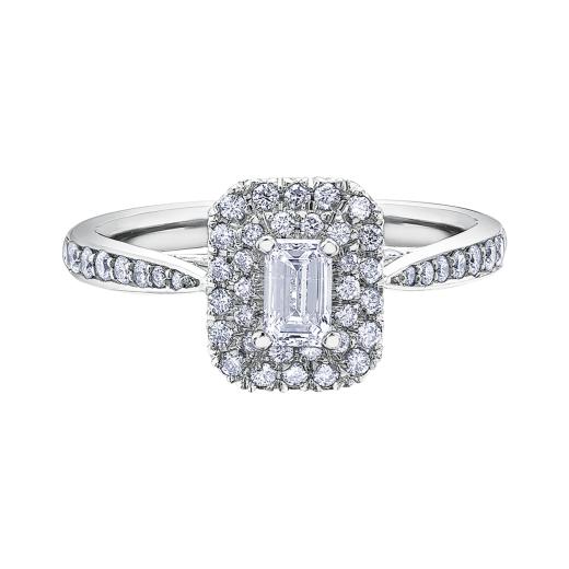 From our exclusive Glacier Fire Canadian Diamond bridal Collection, this beautiful .71ctw engagement ring is a true Canadian treasure. Crafted in 14k white gold, this beautiful ring features a royal .30ct emerald cut Canadian diamond with diamond halo accents and additional diamonds along the band.