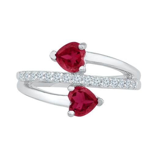 This modern and sophisticated ring is crafted in lustrous 10k white gold and features two heart-shaped created rubies accented by shimmering created white sapphires. Choose this gorgeous style for yourself or the person you love.